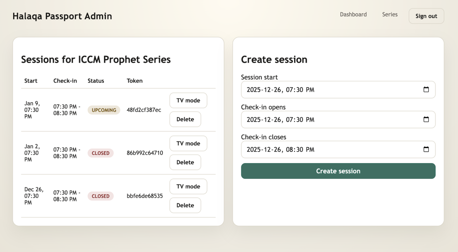 This app works with the Halaqa Passport admin portal used by program organizers to set up sessions and display QR codes: https://youngmomins.com/halaqa-passport